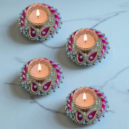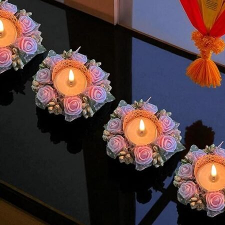 Fancy Dipak for Decoration Diya For Home Decor REUSABLE Traditional Pink Rose Handmade in India Decorative Diya Holder for All Festivals and Celebrations, with CANDLES [Set of 4]