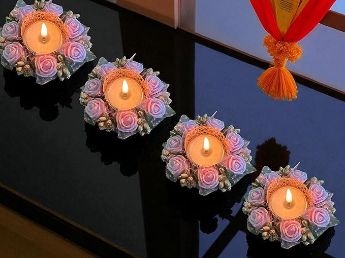 Fancy Dipak for Decoration Diya For Home Decor REUSABLE Traditional Pink Rose Handmade in India Decorative Diya Holder for All Festivals and Celebrations, with CANDLES [Set of 4]